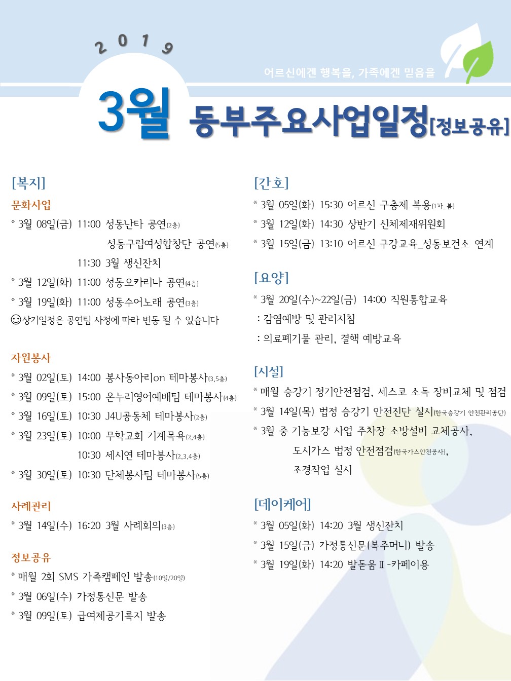 2019년 3월 동부주요사업일정 페이지 정보 작성자 최고관리자 작성일2019-02-27 10:28 조회12,270회 댓글0건 관련링크 이전글 다음글 목록 본문 설레이는 봄이 오는 3월입니다봄 소식처럼 즐겁고 기쁜소식 가득한 한달이 되길 바래봅니다 댓글목록 등록된 댓글이 없습니다. 이전글 다음글 목록