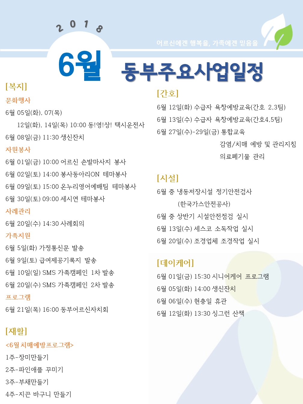2018년 6월 주요사업일정 페이지 정보 작성자 최고관리자 작성일2018-05-30 15:53 조회12,151회 댓글0건 관련링크 이전글 다음글 목록 본문 6월 동부주요사업일정여름의 시작을 알리는 6월입니다! 날씨가 갑자기 더워지고 습도도 높아지고 있는데요~더운 날씨인 만큼 건강에 소홀하지 않도록 유의하시기 바랍니다 댓글목록 등록된 댓글이 없습니다. 이전글 다음글 목록