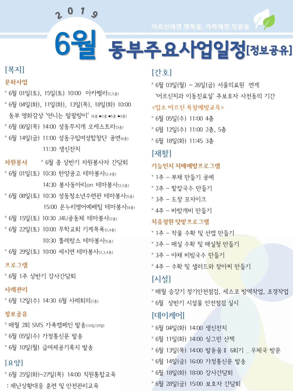 2019년 6월 동부주요사업일정 페이지 정보 작성자 최고관리자 작성일2019-05-29 17:25 조회12,246회 댓글0건 관련링크 이전글 다음글 목록 본문 댓글목록 등록된 댓글이 없습니다. 이전글 다음글 목록
