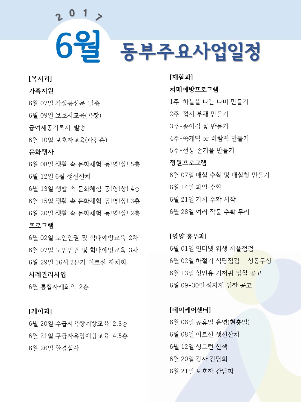 2017년 6월 동부주요사업일정 페이지 정보 작성자 최고관리자 작성일2017-05-31 16:03 조회12,714회 댓글0건 관련링크 이전글 다음글 목록 본문 2017년도 6월 동부 주요사업일정입니다.날씨가 더워지고 있습니다. 동부가족들 모두 건강관리 유의하세요~ 댓글목록 등록된 댓글이 없습니다. 이전글 다음글 목록