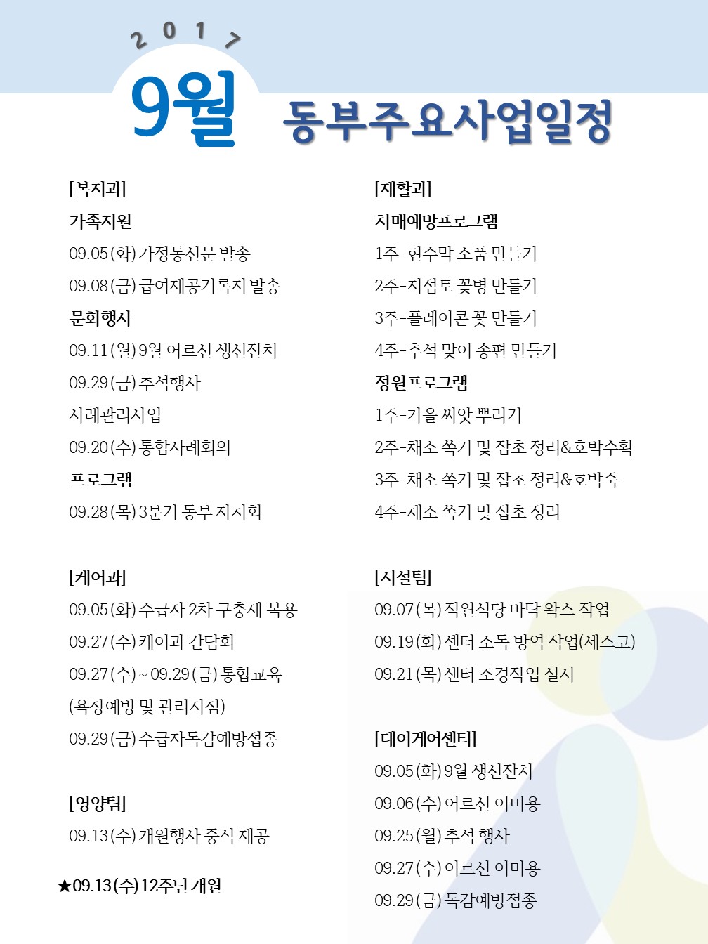 2017년도 9월 동부주요사업일정 페이지 정보 작성자 최고관리자 작성일2017-09-01 14:29 조회12,740회 댓글0건 관련링크 이전글 다음글 목록 본문 9월 동부주요사업일정입니다. 날씨가 쌀쌀해지고 있습니다. 건강관리 유의하시고 행복한 센터생활 되시길 바랍니다! 댓글목록 등록된 댓글이 없습니다. 이전글 다음글 목록