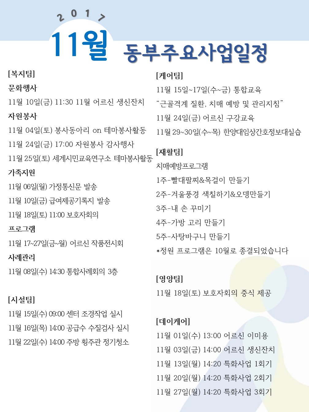 2017년 11월 동부주요사업일정 페이지 정보 작성자 최고관리자 작성일2017-10-30 18:12 조회12,565회 댓글0건 관련링크 이전글 다음글 목록 본문 11월 동부주요사업일정입니다. 많이 추워진 날씨, 건강관리 잘하고 행복한 11월 보내세요~~ 댓글목록 등록된 댓글이 없습니다. 이전글 다음글 목록