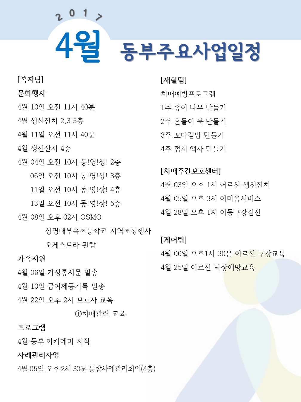 2017년 4월 동부주요사업일정 페이지 정보 작성자 최고관리자 작성일2017-03-31 09:31 조회13,079회 댓글0건 관련링크 이전글 다음글 목록 본문 2017년도 4월 동부주요사업일정입니다. 댓글목록 등록된 댓글이 없습니다. 이전글 다음글 목록