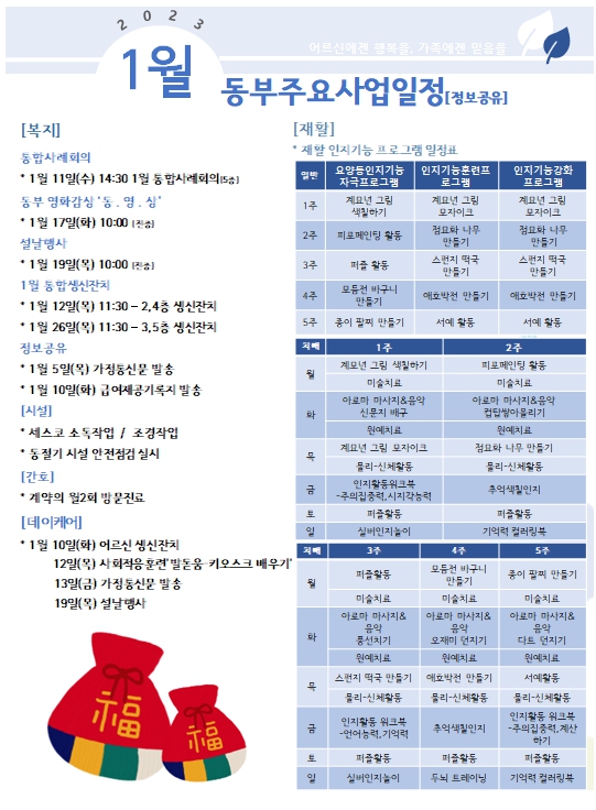 2023년 01월 동부주요사업일정 페이지 정보 작성자 최고관리자 작성일2023-01-05 15:26 조회12,552회 댓글0건 관련링크 이전글 다음글 목록 본문 댓글목록 등록된 댓글이 없습니다. 이전글 다음글 목록
