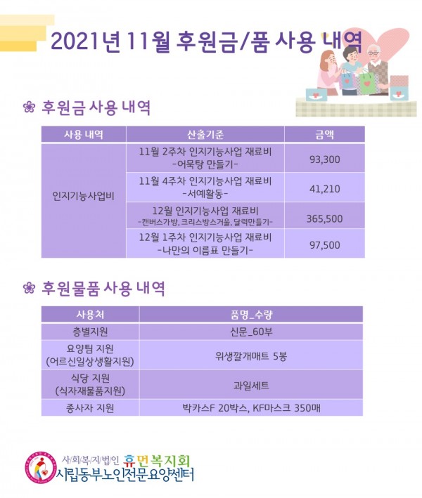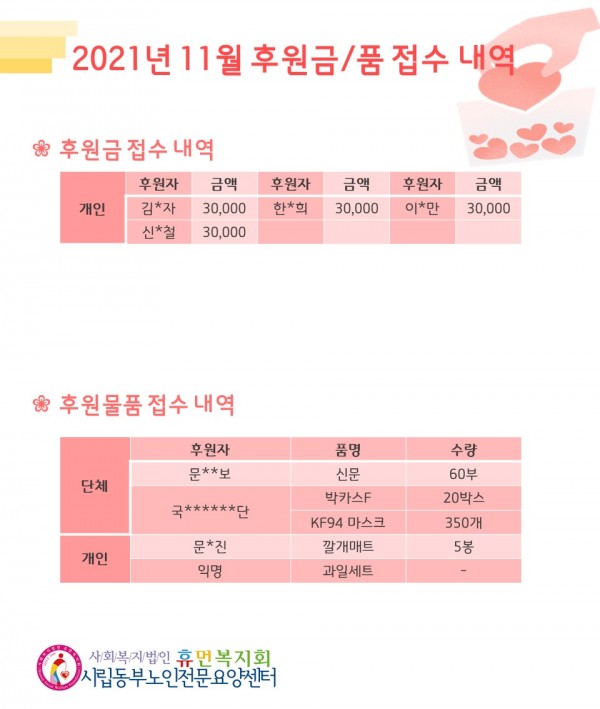 2021년 11월 후원금/품 접수내역, 사용내역 페이지 정보 작성자 최고관리자 작성일2021-12-07 10:48 조회12,237회 댓글0건 관련링크 이전글 다음글 목록 본문 11월에도 우리 센터에 관심과 사랑을 베풀어주셔서 감사합니다.성큼 다가온 겨울 추위에 감기와 코로나 조심하시고, 12월에도 많은 사랑 부탁드립니다. 댓글목록 등록된 댓글이 없습니다. 이전글 다음글 목록