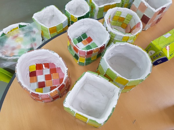 - 타일을 같이 붙이니 단단하고 색상도 다양해서 이쁘고 좋다고 이야기 해주시며 즐겁게 만들어 주셨습니다.
