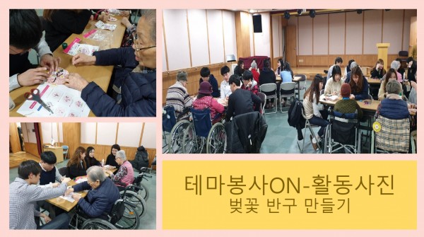 앞으로 다가오는 봄을 맞이 하여, 어르신들과 테마봉사 ON 동아리와 함께 '벚꽃 반구 만들기'를 진행 하였습니다.